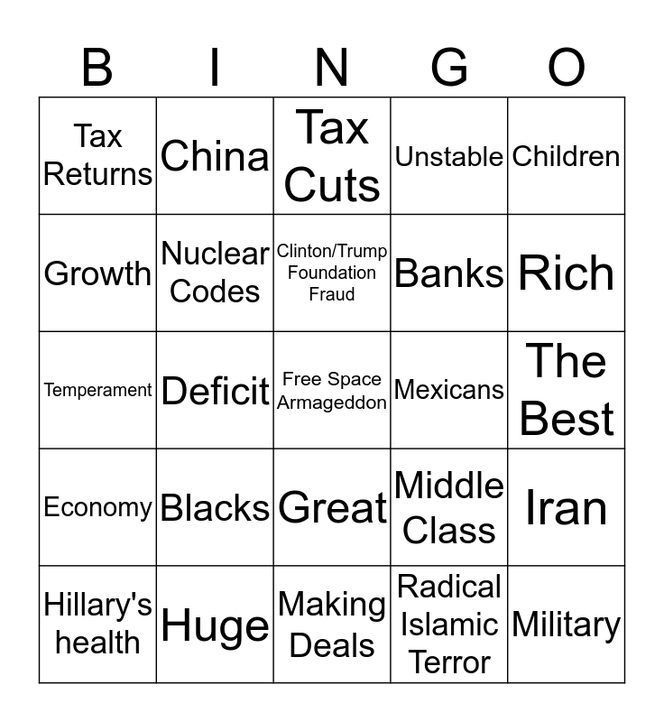 This bingo card has a free space and 24 words: Blacks, Huge, Clinton/Trump Foundation Fraud, Hillary's health, Children, Tax Returns, Growth, China, Mexicans, Great, Banks, Temperament, Middle Class, Iran, Nuclear Codes, Radical Islamic Terror, The Best, Tax Cuts, Rich, Deficit, Military, Economy, Unstable and Making Deals.