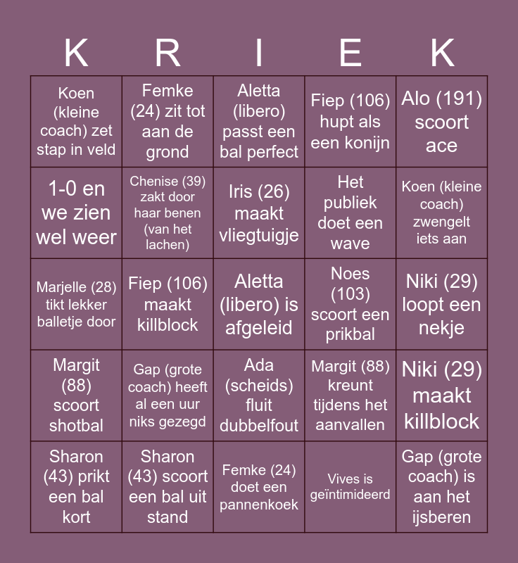 This bingo card has 36 words: Free!, Chenise (39) krijgt geel, Chenise (39) scoort dia binnen de drie, Chenise (39) zakt door haar benen (van het lachen), Margit (88) kreunt tijdens het aanvallen, Margit (88) scoort shotbal, Iris (26) maakt vliegtuigje, Iris (26) blokkeert een bal, Alo (191) scoort ace, Alo (191) legt hem op de lijn, Fiep (106) maakt killblock, Fiep (106) hupt als een konijn, Noes (103) wordt chagrijnig, Noes (103) scoort een prikbal, Koen (kleine coach) zwengelt iets aan, Koen (kleine coach) zet stap in veld, Gap (grote coach) is aan het ijsberen, Gap (grote coach) heeft al een uur niks gezegd, Aletta (libero) is afgeleid, Aletta (libero) passt een bal perfect, Niki (29) loopt een nekje, Niki (29) maakt killblock, Sharon (43) scoort een bal uit stand, Sharon (43) prikt een bal kort, Femke (24) doet een pannenkoek, Femke (24) zit tot aan de grond, Marjelle (28) tikt lekker balletje door, Mariëlle (28) geeft perfecte set, Het publiek doet een wave, 1-0 en we zien wel weer, Je hebt een liedje ingezet, Er wordt vals gezongen, Vives is geïntimideerd, Ada (scheids) fluit dubbelfout, Ada (scheid) fluit voor bal in veld and Telo belt in vanuit de Filipijnen.