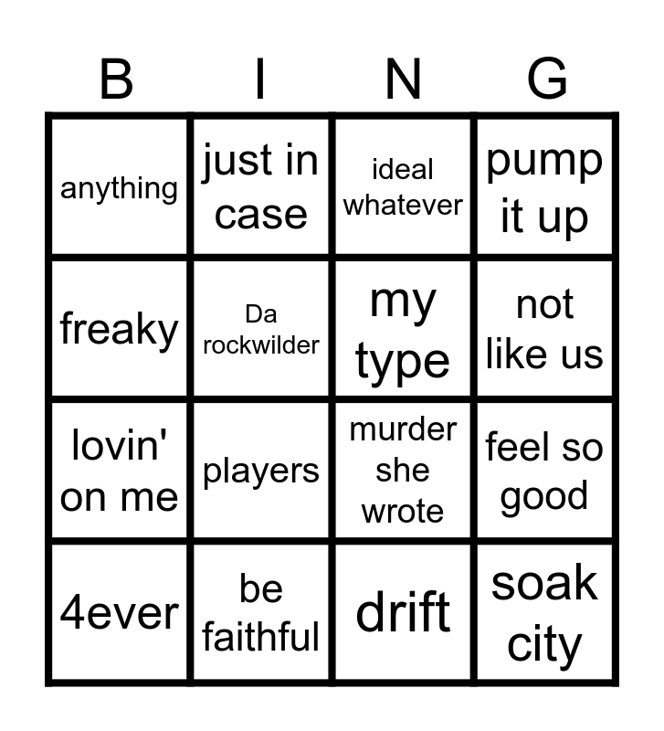 This bingo card has 25 words: still not a player, too close, not like us, this is how we do it, freaky, anything, Da rockwilder, just in case, be faithful, nasty, lovin' on me, murder she wrote, nasty, fat juicy & wet, my type, I'm so into you, drift, ideal whatever, players, feel so good, 4ever, love like this, soak city, pump it up and wit it.