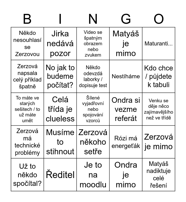 This bingo card has 25 words: Musíme to stihnout, Je to na moodlu, Někdo odevzdá laborky / dopisuje test, Už to někdo spočítal?, Maturanti..., Někdo nesouhlasí se Zerzovou, Zerzová napsala celý příklad špatně, Jirka nedává pozor, Ondra si vezme referát, Zerzová někoho setře, Nestíháme, To máte ve starých sešitech / to už máte umět, Rózi má energeťák, Zerzová je mimo, No jak to budeme počítat?, Matyáš nadiktuje celé řešení, Venku se děje něco zajímavějšího než ve třídě, Video se špatným obrazem nebo zvukem, Kdo chce / půjdete k tabuli, Celá třída je clueless, Šílené vyjadřovní nebo spojování vzorců, Ředitel, Zerzová má technické problémy, Matyáš je mimo and Ondra je mimo.