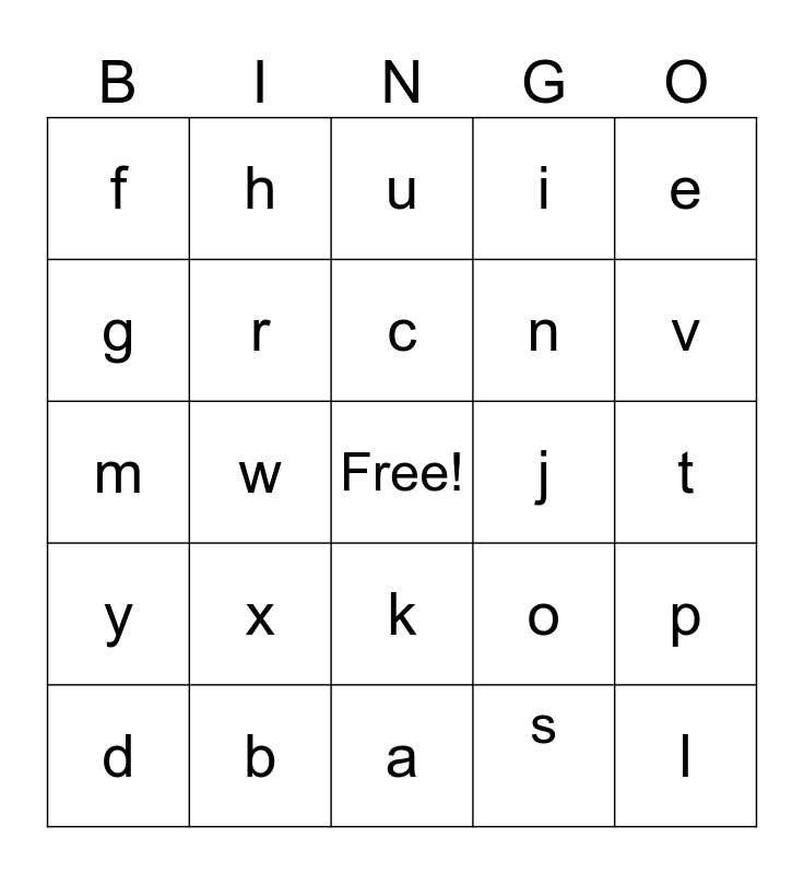 This bingo card has a free space and 24 words: x, b, c, d, e, f, g, h, j, k, n, m, o, p, r, s, t, u, v, w, l, y, i and a.