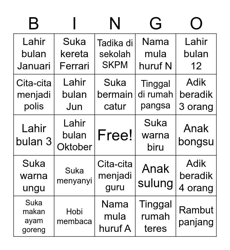 This bingo card has a free space and 25 words: Suka menyanyi, Nama mula huruf A, Suka bermain catur, Suka makan ayam goreng, Lahir bulan 12, Lahir bulan Januari, Cita-cita menjadi polis, Suka kereta Ferrari, Suka warna biru, Cita-cita menjadi guru, Tinggal di rumah pangsa, Lahir bulan 3, Anak sulung, Adik beradik 4 orang, Lahir bulan Jun, Asal negeri Johor, Anak bongsu, Tadika di sekolah SKPM, Adik beradik 3 orang, Lahir bulan Oktober, Rambut panjang, Hobi membaca, Suka warna ungu, Nama mula huruf N and Tinggal rumah teres.