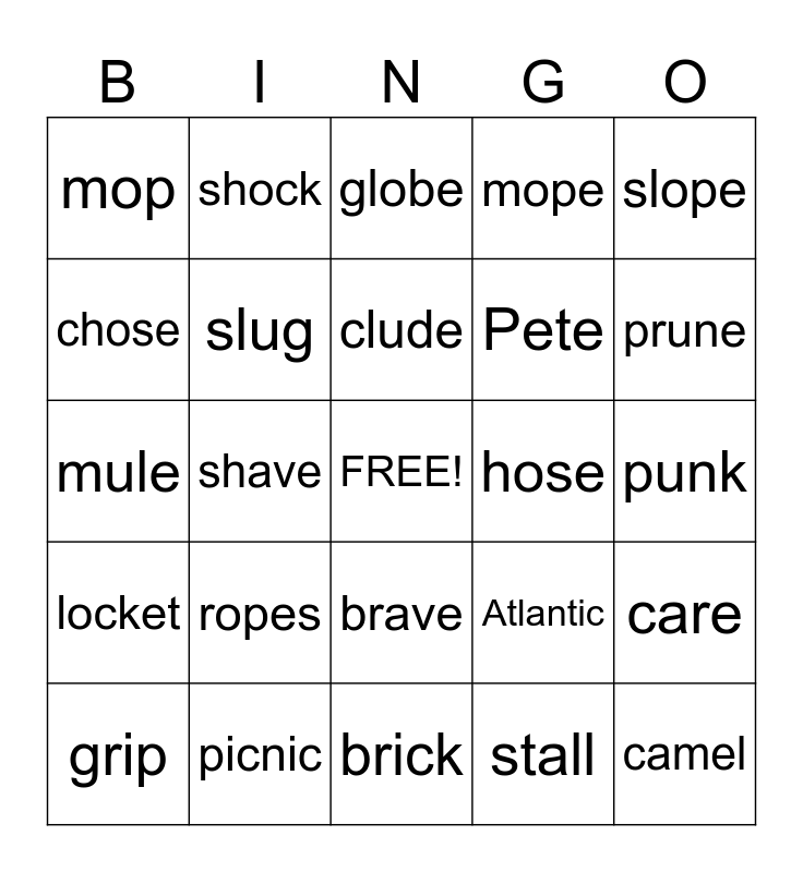 This bingo card has a free space and 24 words: ropes, picnic, clude, grip, slope, mop, chose, shock, hose, brave, Pete, mule, Atlantic, care, slug, stall, punk, globe, prune, shave, camel, locket, mope and brick.