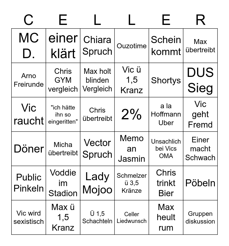 This bingo card has 66 words: Einer Kotzt, Chris trinkt Bier, Vic übertreibt, Micha übertreibt, Voddie im Stadion, Ü50EUR an ALK, einer klärt, RE einreit en, Chris GYM vergleich, Consti Gruppen ansage, Vic geht Fremd, Mett Häpp chen, Chris übertreibt, Schein kommt, Venus Celler, Max übertreibt, DUS Sieg, MC D., Schein verloren, Max holt blinden Vergleich, a la Hoffmann Uber, 2%, Ouzotime, Vic wird sexistisch, Consti übertreibt, Max heult rum, Ü 1,5 Schachteln, Schmelzer, Vic raucht, CONSTI OHNE CON, Vector Spruch, Mutter Spruch, Lallen bei allen, Karneval Musik, Döner, Memo an Jasmin, Altstadt über 100EUR, Shortys, Einer macht Schwach, Gruppen diskussion, Arno Freirunde, Lady Mojoo, "ich hätte ihn so eingeritten", Consti verkauft MSCI, Chris ü 4,5 VodkaE, Max ü 1,5 Kranz, Vic ü 1,5 Kranz, Consti ü 1,5 Kranz, Public Pinkeln, Schmelzer ü 3,5 Kränze, Wo ist mein Schlüssel? (VIC), "Guck mal da vorne", Chris Gehalt vgl., Max Mom ruft an, Geldschein im Mund, Pöbeln, Handschlag mit Chris Celler, Jasmin Spruch, Chiara Spruch, Unsachlich bei Vics OMA, Celler Liedwunsch, Schmelzer Liedwunsch, Blinder Call, Bierfleck, Chris ü 2,5 Bier and Consti schreit rum.
