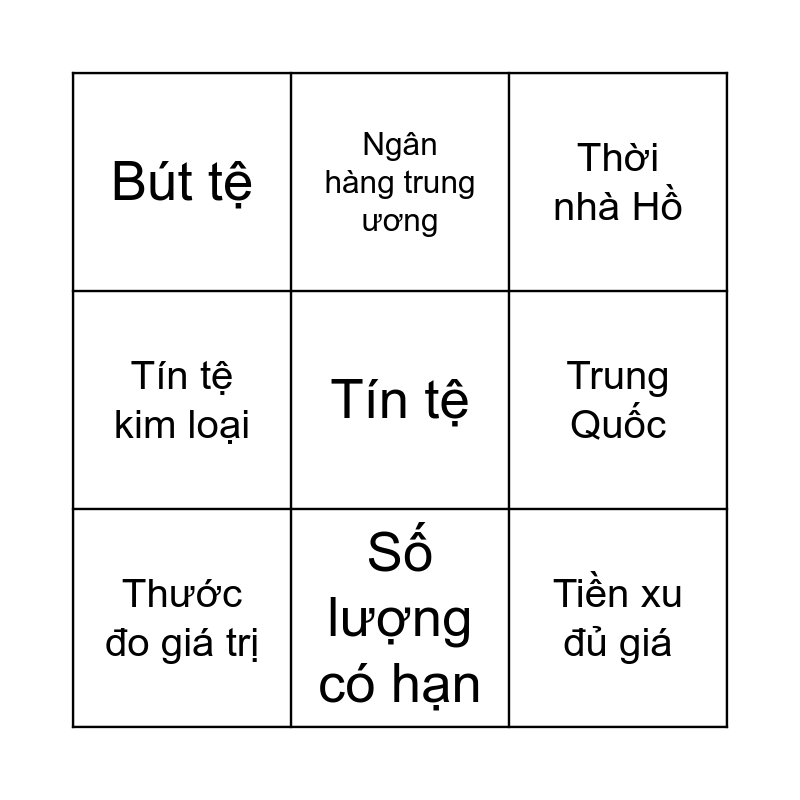 This bingo card has a free space and 8 words: Trung Quốc, Thời nhà Hồ, Ngân hàng trung ương, Thước đo giá trị, Bút tệ, Tiền xu đủ giá, Tín tệ kim loại and Số lượng có hạn.