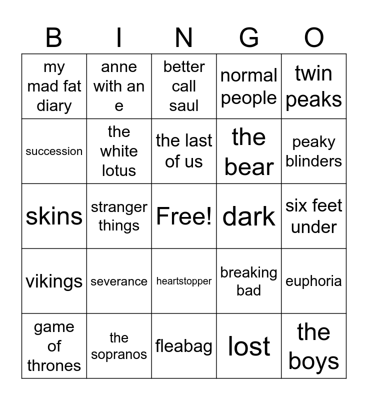 This bingo card has a free space and 24 words: game of thrones, severance, the last of us, lost, twin peaks, my mad fat diary, anne with an e, better call saul, dark, six feet under, skins, the white lotus, breaking bad, euphoria, succession, the sopranos, fleabag, normal people, peaky blinders, vikings, stranger things, heartstopper, the bear and the boys.