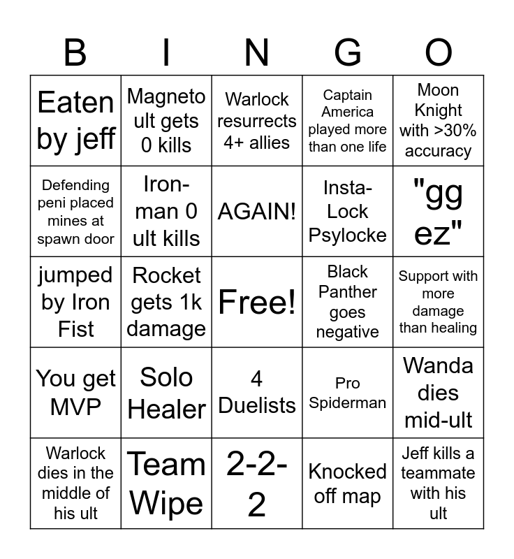 This bingo card has a free space and 24 words: Solo Healer, Team Wipe, AGAIN!, Warlock dies in the middle of his ult, Moon Knight with >30% accuracy, Eaten by jeff, Defending peni placed mines at spawn door, Magneto ult gets 0 kills, Black Panther goes negative, 4 Duelists, Insta-Lock Psylocke, jumped by Iron Fist, Pro Spiderman, Wanda dies mid-ult, Iron-man 0 ult kills, Knocked off map, Support with more damage than healing, Warlock resurrects 4+ allies, "gg ez", Rocket gets 1k damage, Jeff kills a teammate with his ult, You get MVP, Captain America played more than one life and 2-2-2.