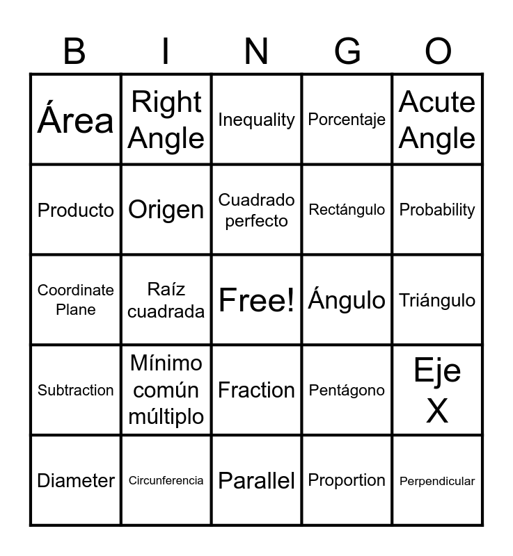 This bingo card has a free space and 54 words: Suma, Subtraction, Multiplication, División, Fraction, Decimal, Porcentaje, Ratio, Producto, Quotient, Área, Perimeter, Circunferencia, Diameter, Radio, Parallel, Perpendicular, Rectángulo, Square, Triángulo, Pentágono, Hexagon, Ángulo, Acute Angle, Obtuso, Right Angle, Congruente, Similar, Escala, Proportion, Ecuación, Variable, Coefficient, Expresión, Inequality, Gráfica, Coordinate Plane, Eje X, Y-axis, Origen, Positivo, Negative, Entero, Decimal, Mínimo común múltiplo, Greatest Common Factor, Exponente, Base, Cuadrado perfecto, Raíz cuadrada, Probability, Media, Mediana and Modo.