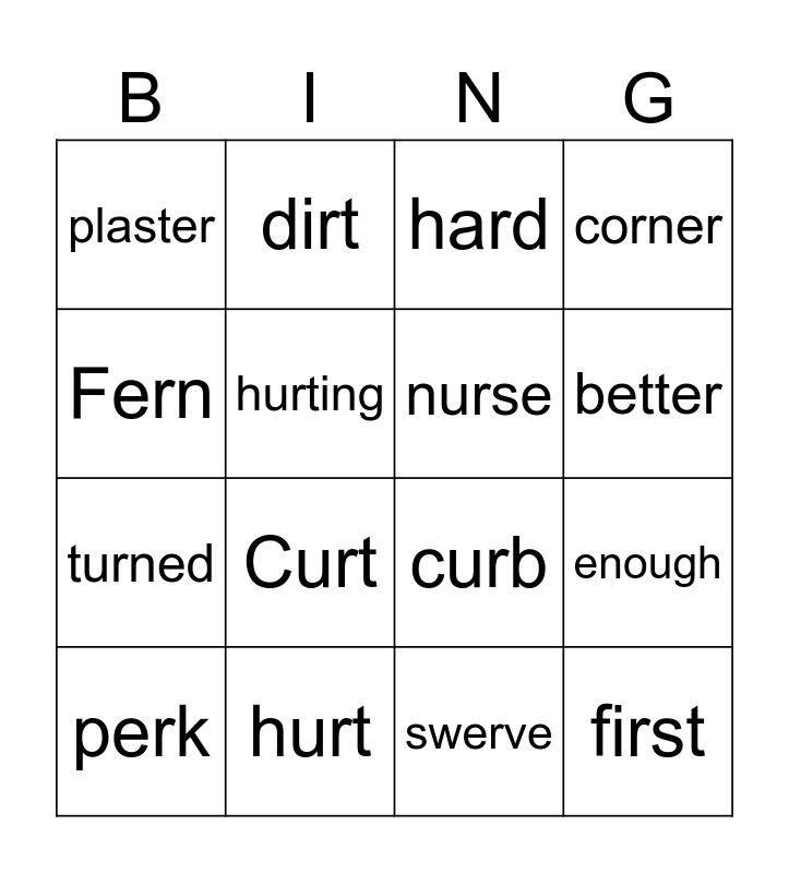 This bingo card has 16 words: hurt, enough, hard, plaster, turned, dirt, curb, swerve, Fern, hurting, perk, corner, Curt, better, nurse and first.