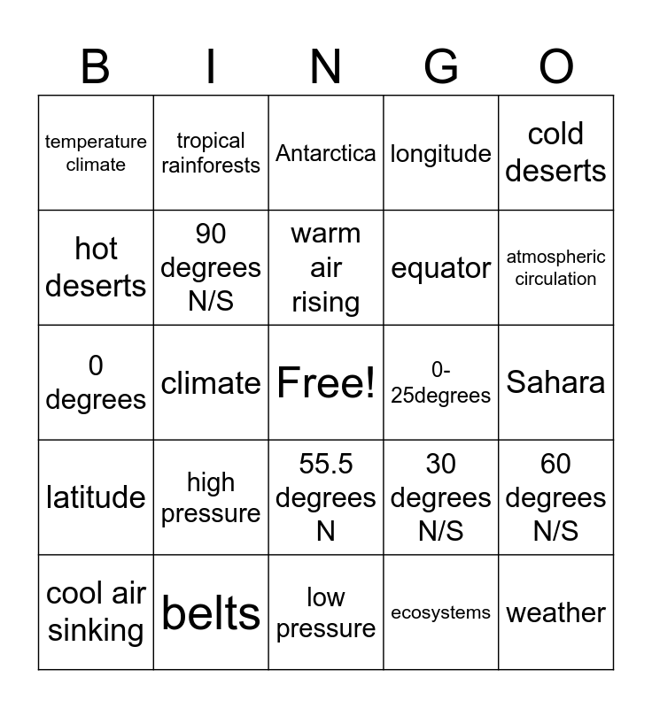 This bingo card has a free space and 25 words: high pressure, low pressure, warm air rising, cool air sinking, cold deserts, temperature climate, hot deserts, tropical rainforests, 0-25degrees, 55.5 degrees N, equator, 0 degrees, 30 degrees N/S, 60 degrees N/S, 90 degrees N/S, UK, Sahara, Antarctica, atmospheric circulation, climate, weather, belts, latitude, longitude and ecosystems.