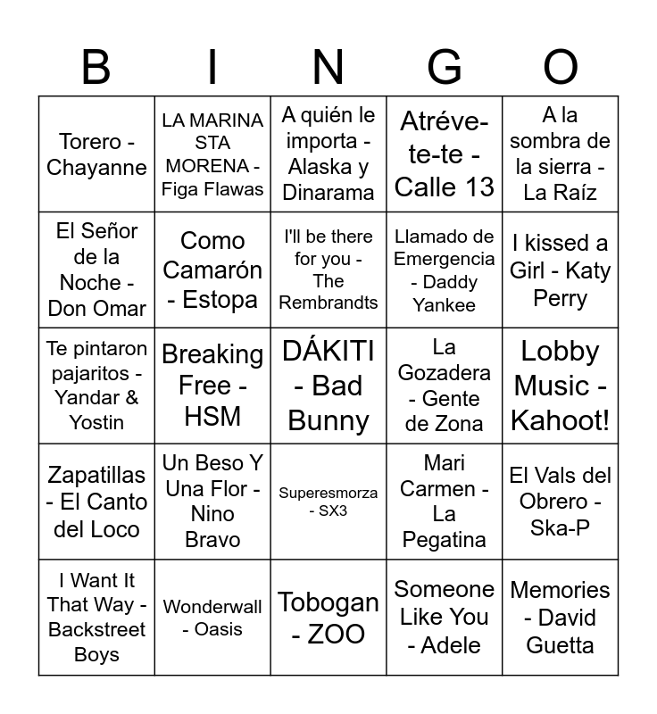This bingo card has 51 words: Sweet Caroline - Neil Diamond, DÁKITI - Bad Bunny, Viva La Vida - Colplay, Tobogan - ZOO, Un Beso Y Una Flor - Nino Bravo, Gimme! Gimme! Gimme! - ABBA, LA MARINA STA MORENA - Figa Flawas, La casa por el tejado - Fito y Fitipaldis, El Señor de la Noche - Don Omar, La_Original.mp3 - Emilia, TINI, Como Camarón - Estopa, Atréve-te-te - Calle 13, El Vals del Obrero - Ska-P, Mari Carmen - La Pegatina, Caminando por la vida - Melendi, Feed From Desire - Gala, I'll be there for you - The Rembrandts, La Gozadera - Gente de Zona, Fiesta Pagana - Mago de Oz, A la sombra de la sierra - La Raíz, Breaking Free - HSM, Someone Like You - Adele, Torero - Chayanne, Llamado de Emergencia - Daddy Yankee, El universo sobre mi - Amaral, Memories - David Guetta, I kissed a Girl - Katy Perry, Tik Tok - Kesha, I Want It That Way - Backstreet Boys, A quién le importa - Alaska y Dinarama, Valentina - 31 FAM, DIABLA - Figa Flawas, Fiebre - Bad Gyal, Safaera - Bad Bunny, I Will Survive - Gloria Gaynor, Wonderwall - Oasis, Sarà perché ti amo - DJ Matrix, El Burrito Sabanero - David Bisbal, Esbarzers - ZOO i La Gossa Sorda, El Baile del Cuadrado - Los Rebos, Lobby Music - Kahoot!, Zapatillas - El Canto del Loco, Prendio - RVFV i Omar Montes, El Carton - Crazy Design, Mambo No.5 - Lou Bega, Potra Salvaje - Isabel Aaiún, Te pintaron pajaritos - Yandar & Yostin, Princesas - Pereza, The Nights - Avicii, Superesmorza - SX3 and Antes Muerta Que Sencilla - María Isabel.