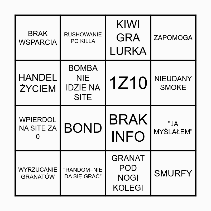 This bingo card has 16 words: "RANDOM=NIE DA SIĘ GRAĆ", "JA MYŚLAŁEM", KIWI GRA LURKA, BRAK WSPARCIA, WPIERDOL NA SITE ZA 0, RUSHOWANIE PO KILLA, BRAK INFO, GRANAT POD NOGI KOLEGI, HANDEL ŻYCIEM, BOMBA NIE IDZIE NA SITE, WYRZUCANIE GRANATÓW, ZAPOMOGA, BOND, NIEUDANY SMOKE, 1Z10 and SMURFY.