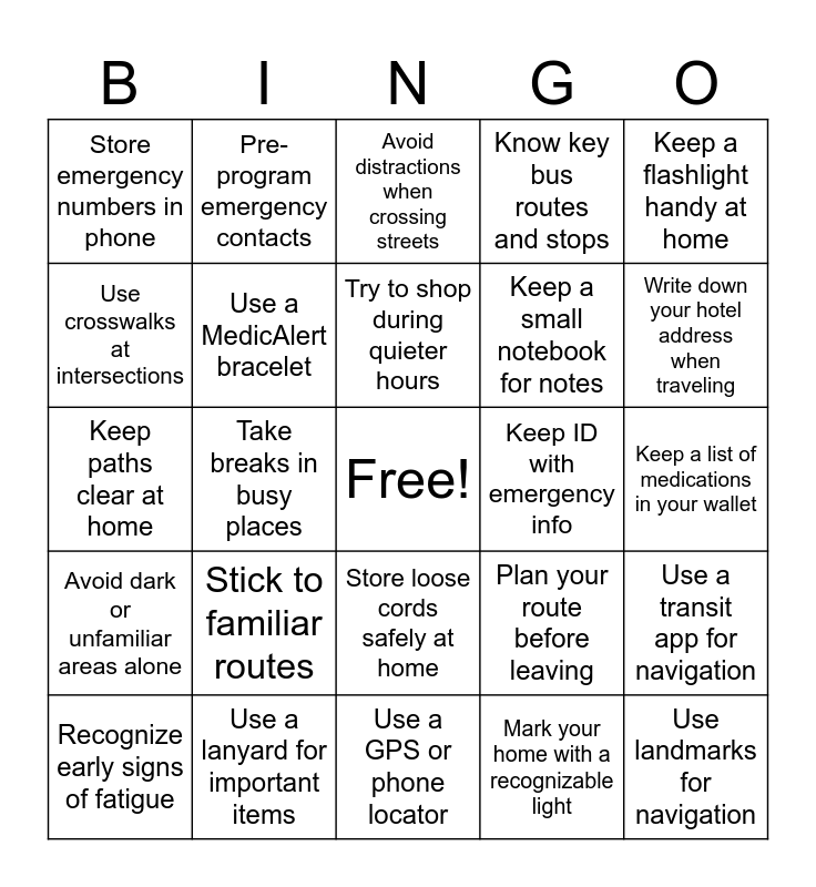 This bingo card has a free space and 52 words: Carry a safety card, Use landmarks for navigation, Ask for help if lost, Use a GPS or phone locator, Stick to familiar routes, Take a photo of parking spot, Pre-program emergency contacts, Tell a bus driver your stop, Use crosswalks at intersections, Avoid going out when tired, Use a MedicAlert bracelet, Look for landmarks when shopping, Use a transit app for navigation, Plan your route before leaving, Inform someone of your plans, Use a door chime for home safety, Try to shop during quieter hours, Keep ID with emergency info, Walk with a friend when possible, Keep a flashlight handy at home, Take breaks in busy places, Mark your home with a recognizable light, Store emergency numbers in phone, Keep a small notebook for notes, Be aware of common scams, Use caller ID to screen unknown numbers, Ask store employees for directions, Use an alert device for home security, Write down your hotel address when traveling, Use reflective tape on stairs, Set reminders for medications, Know key bus routes and stops, Use a car alarm to locate vehicle, Practice safety routines regularly, Look for public family washrooms, Avoid distractions when crossing streets, Use a lanyard for important items, Take a picture of important locations, Set up a buddy system for safety, Have a consistent walking path, Use a raised toilet seat for stability, Keep a list of medications in your wallet, Avoid dark or unfamiliar areas alone, Have a designated meeting spot, Store loose cords safely at home, Use a mobility aid if needed, Check for home safety hazards, Keep paths clear at home, Set up speed dial for emergencies, Stay hydrated when going out, Recognize early signs of fatigue and Use a small bag to carry essentials.