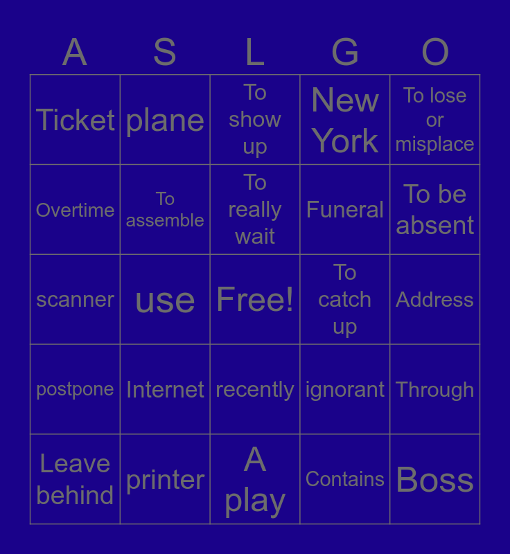 This bingo card has a free space and 33 words: Do you mind, Don’t know, use, To plan, postpone, To assemble, To lose or misplace, Leave behind, plane, Take-off, To really wait, To show up, To be curious, To fall behind, To catch up, To be absent, printer, scanner, Internet, ignorant, recently, Myself, Ticket, Address, A play, Boss, New York, Funeral, Overtime, Through, Maybe, Contains and California.