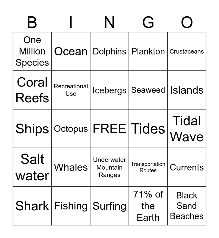 This bingo card has a free space and 24 words: Whales, Fishing, Icebergs, Shark, Crustaceans, One Million Species, Coral Reefs, Ocean, Tides, Underwater Mountain Ranges, Seaweed, Ships, Transportation Routes, Currents, Recreational Use, 71% of the Earth, Tidal Wave, Dolphins, Islands, Octopus, Black Sand Beaches, Salt water, Plankton and Surfing.