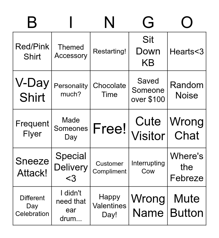 This bingo card has a free space and 25 words: Special Delivery <3, Happy Valentines Day!, Chocolate Time, Different Day Celebration, Hearts<3, Red/Pink Shirt, V-Day Shirt, Themed Accessory, Cute Visitor, Customer Compliment, Saved Someone over $100, Frequent Flyer, Interrupting Cow, Where's the Febreze, Personality much?, Ugh! Occupied, Wrong Chat, Restarting!, Random Noise, Made Someones Day, Mute Button, I didn't need that ear drum..., Sneeze Attack!, Sit Down KB and Wrong Name.