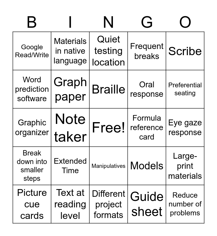 This bingo card has a free space and 24 words: Extended Time, Text at reading level, Braille, Picture cue cards, Scribe, Google Read/Write, Word prediction software, Materials in native language, Formula reference card, Manipulatives, Oral response, Graphic organizer, Models, Large-print materials, Graph paper, Guide sheet, Eye gaze response, Quiet testing location, Preferential seating, Note taker, Reduce number of problems, Break down into smaller steps, Frequent breaks and Different project formats.