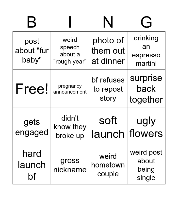 This bingo card has 16 words: gross nickname, ugly flowers, photo of them out at dinner, post about "fur baby", gets engaged, weird speech about a "rough year", soft launch, weird hometown couple, Free!, pregnancy announcement, hard launch bf, drinking an espresso martini, didn't know they broke up, surprise back together, bf refuses to repost story and weird post about being single.