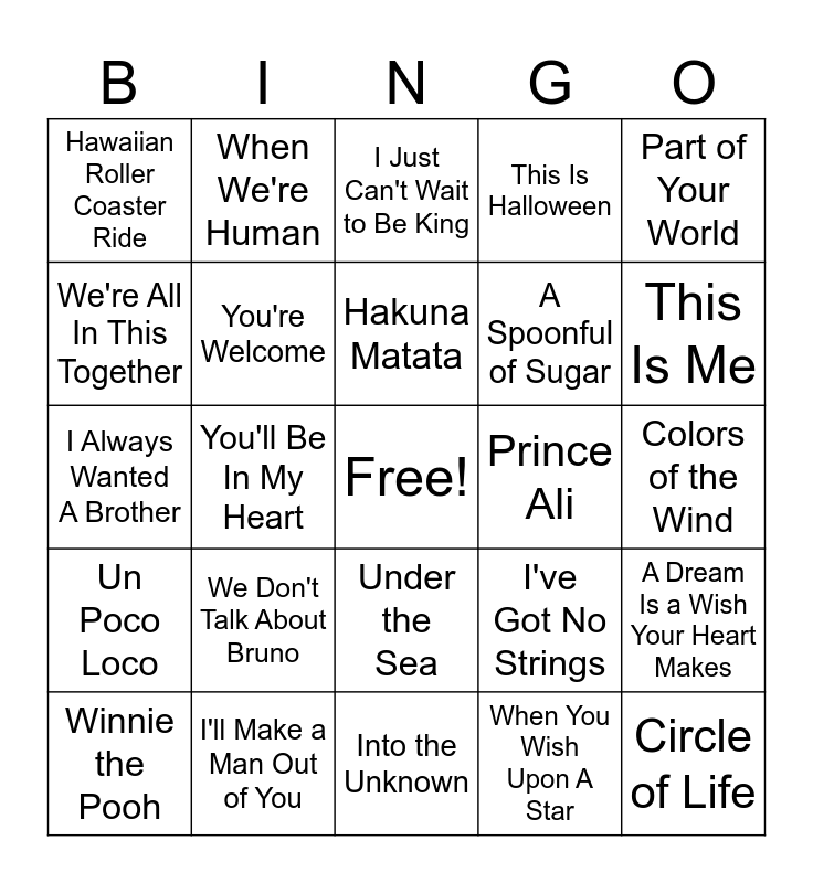 This bingo card has a free space and 40 words: Let It Go, I Always Wanted A Brother, All I Want, You're Welcome, I'll Make a Man Out of You, Under the Sea, Hakuna Matata, A Whole New World, Part of Your World, Un Poco Loco, You'll Be In My Heart, This Is Halloween, Circle of Life, Colors of the Wind, Prince Ali, We Don't Talk About Bruno, Rotten to the Core, Hawaiian Roller Coaster Ride, When Will My Life Begin?, I Just Can't Wait to Be King, A Dream Is a Wish Your Heart Makes, When You Wish Upon A Star, A Spoonful of Sugar, We're All In This Together, A Cover Is Not the Book, Love Is an Open Door, Nobody Like U, You've Got a Friend in Me, Almost There, Once Upon a Dream, The Bare Necessities, Winnie the Pooh, What Dreams Are Made Of, I've Got No Strings, This Is Me, Into the Unknown, Belle, Strangers Like Me, When We're Human and Surf’s Up.
