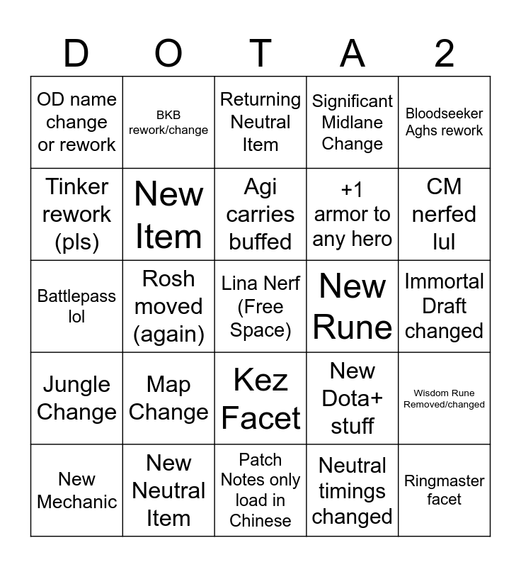 This bingo card has a free space and 24 words: Map Change, New Neutral Item, Agi carries buffed, New Mechanic, Bloodseeker Aghs rework, OD name change or rework, Tinker rework (pls), BKB rework/change, New Rune, Kez Facet, +1 armor to any hero, Battlepass lol, New Dota+ stuff, Wisdom Rune Removed/changed, New Item, Neutral timings changed, Immortal Draft changed, Returning Neutral Item, CM nerfed lul, Rosh moved (again), Ringmaster facet, Jungle Change, Significant Midlane Change and Patch Notes only load in Chinese.