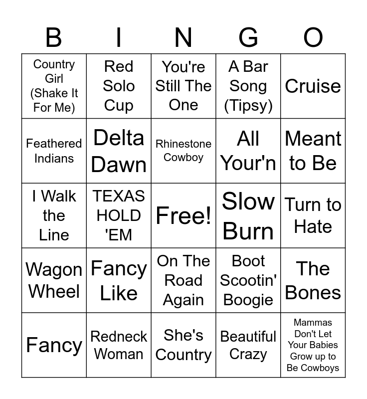 This bingo card has a free space and 40 words: Jolene, I Walk the Line, Stand By Your Man, Delta Dawn, Redneck Woman, On The Road Again, Rhinestone Cowboy, Before He Cheats, Cruise, Wagon Wheel, TEXAS HOLD 'EM, A Bar Song (Tipsy), Mammas Don't Let Your Babies Grow up to Be Cowboys, Turn to Hate, Slow Burn, Fancy Like, Man! I Feel Like A Woman!, Country Girl (Shake It For Me), Fast Car, You're Still The One, The Bones, Beautiful Crazy, All Your'n, Feathered Indians, I Had Some Help, Grandpa, The Git Up, If I Die Young, Goodbye Earl, Teardrops On My Guitar, Travelin' Soldier, Fancy, This One's for the Girls, Boot Scootin' Boogie, Meant to Be, She's Country, Somebody Like You, She Thinks My Tractor's Sexy, Red Solo Cup and Save a Horse (Ride a Cowboy).
