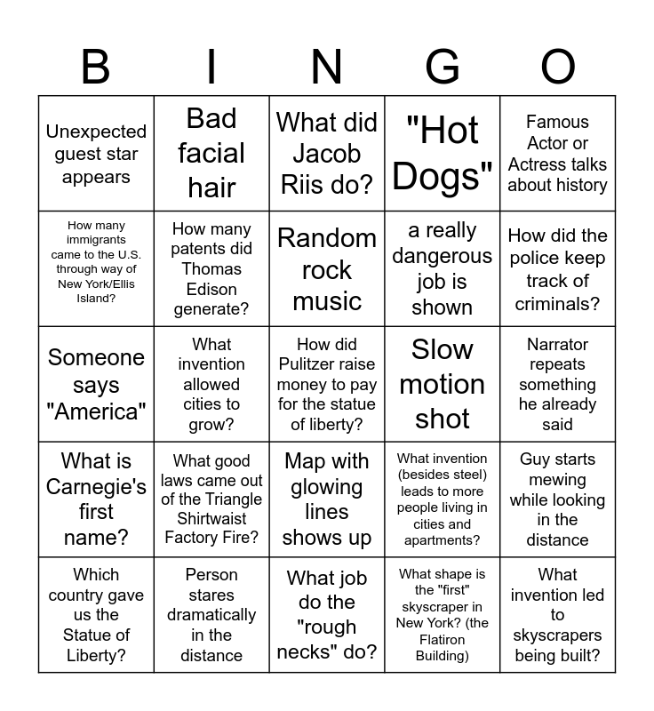 This bingo card has 29 words: Which country gave us the Statue of Liberty?, What island do people immigrate through in NYC?, What invention allowed cities to grow?, What invention led to skyscrapers being built?, Unexpected guest star appears, What did Jacob Riis do?, How many patents did Thomas Edison generate?, What good laws came out of the Triangle Shirtwaist Factory Fire?, Slow motion shot, Person stares dramatically in the distance, Narrator repeats something he already said, How did Pulitzer raise money to pay for the statue of liberty?, What job do the "rough necks" do?, What shape is the "first" skyscraper in New York? (the Flatiron Building), How did the police keep track of criminals?, Computer Generated Animation, Map with glowing lines shows up, What is Carnegie's first name?, Famous Actor or Actress talks about history, Someone says "America", What invention (besides steel) leads to more people living in cities and apartments?, Black and white video, a really dangerous job is shown, How many immigrants came to the U.S. through way of New York/Ellis Island?, "Hot Dogs", Bad facial hair, Guy starts mewing while looking in the distance, Random rock music and How much are "roughnecks" paid.