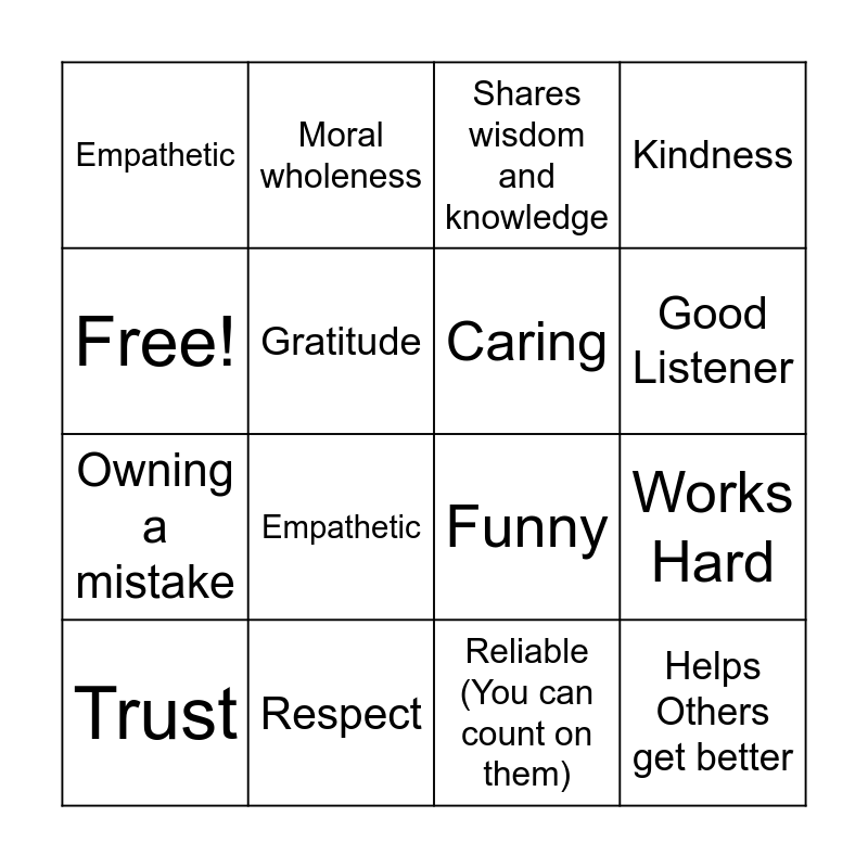 This bingo card has 37 words: Non-Judgmental, Supportive, Honesty, Good Listener, Go the extra mile, Respect, Funny, Patience, Free!, Forgiving, Reliable (You can count on them), Kindness, Trust, Empathetic, Caring, Encouraging, Shows Respect, Moral wholeness, Helping in a situation, Helps Others get better, Empathetic, Gratitude, Humility, Encouragement, Problem Solver, Doing your best, Shares wisdom and knowledge, Stays Positive, Respecting Privacy, Being a good listener, Reliable, Shows appreciation, Owning a mistake, Shows concern, Trust, Works Hard and Respecting points of view.