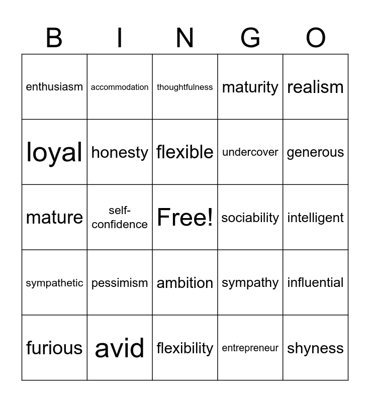 This bingo card has a free space and 56 words: anonymous, furious, creativity, enthusiasm, flexibility, generosity, honesty, idealism, undercover, insane, maturity, modesty, optimism, patience, authority, punctuality, realism, self-confidence, seriousness, shyness, sociability, psychiatric, sympathy, thoughtfulness, enthusiastic, flexible, pessimistic, optimistic, generous, ambitious, cheerful, creative, honest, idealistic, intelligent, loyal, mature, modest, sympathetic, accommodation, ambition, cheerfulness, intelligence, loyalty, stubbornness, pessimism, avid, fund, entertainer, parliament, entrepreneur, ecology, editor, initiative, influential and maintain.