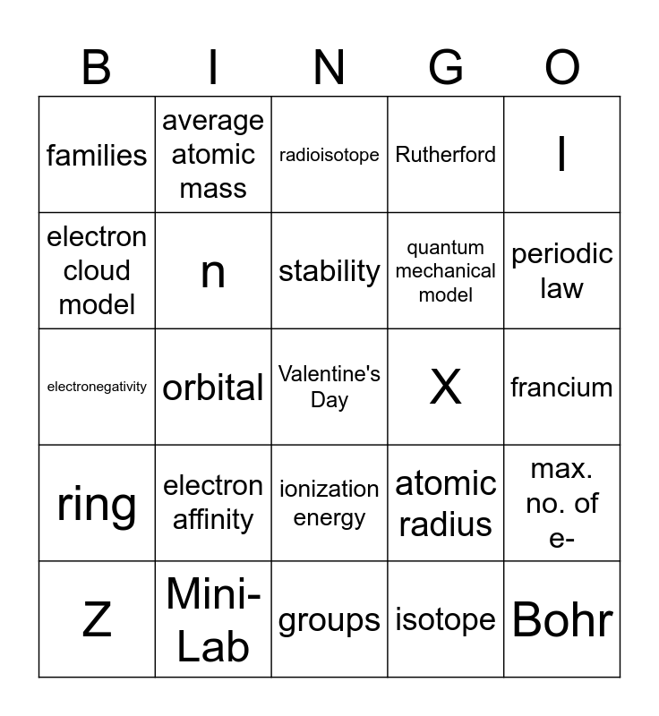 This bingo card has a free space and 32 words: isotope, neutron, orbital, shell, ring, n, l, max. no. of e-, average atomic mass, u or amu, stability, radioisotope, isotope, isotopic notation, X, A, Z, electronegativity, ionization energy, electron affinity, atomic radius, fluorine, francium, Mini-Lab, Bohr, Rutherford, quantum mechanical model, electron cloud model, families, groups, periods and periodic law.