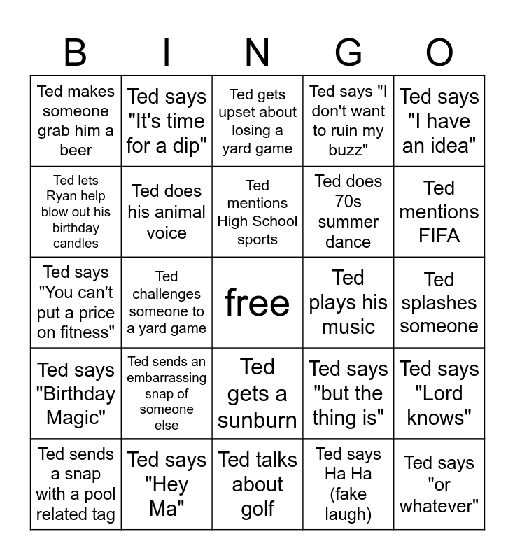 This bingo card has a free space and 24 words: Ted sends a snap with a pool related tag, Ted sends an embarrassing snap of someone else, Ted mentions High School sports, Ted says Ha Ha (fake laugh), Ted says "I have an idea", Ted makes someone grab him a beer, Ted says "It's time for a dip", Ted gets upset about losing a yard game, Ted plays his music, Ted splashes someone, Ted says "You can't put a price on fitness", Ted does his animal voice, Ted says "but the thing is", Ted says "Lord knows", Ted lets Ryan help blow out his birthday candles, Ted says "Hey Ma", Ted talks about golf, Ted says "I don't want to ruin my buzz", Ted mentions FIFA, Ted says "Birthday Magic", Ted challenges someone to a yard game, Ted gets a sunburn, Ted does 70s summer dance and Ted says "or whatever".