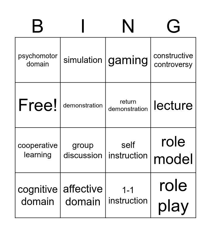This bingo card has 16 words: affective domain, role model, gaming, psychomotor domain, cooperative learning, simulation, self instruction, 1-1 instruction, Free!, demonstration, cognitive domain, constructive controversy, group discussion, lecture, return demonstration and role play.
