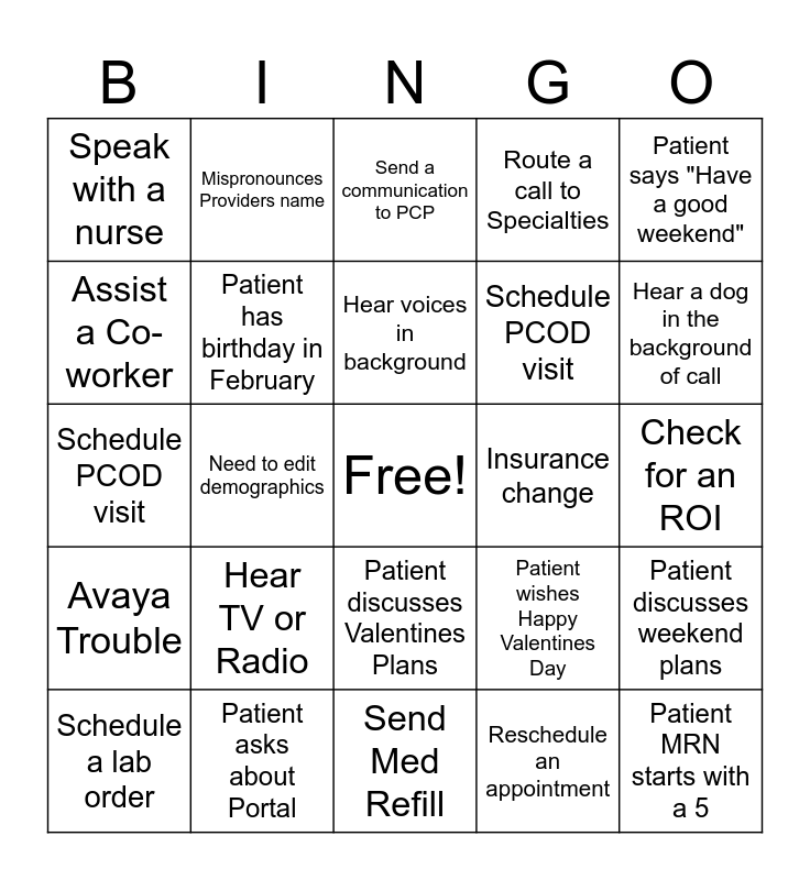 This bingo card has a free space and 24 words: Hear TV or Radio, Patient asks about Portal, Hear voices in background, Schedule a lab order, Patient says "Have a good weekend", Speak with a nurse, Assist a Co-worker, Mispronounces Providers name, Insurance change, Patient discusses Valentines Plans, Schedule PCOD visit, Schedule PCOD visit, Patient wishes Happy Valentines Day, Patient discusses weekend plans, Patient has birthday in February, Reschedule an appointment, Check for an ROI, Send a communication to PCP, Hear a dog in the background of call, Need to edit demographics, Patient MRN starts with a 5, Avaya Trouble, Route a call to Specialties and Send Med Refill.