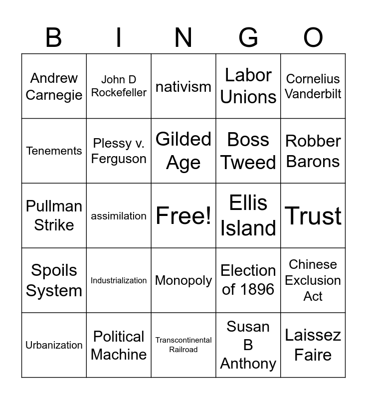 Gilded Age Bingo | Gilded Age | Gilded Age | Gilded Age | Common Assessment #1 Review