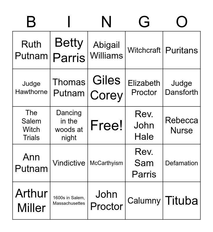 This bingo card has a free space and 24 words: Vindictive, 1600s in Salem, Massachusettes, Giles Corey, Arthur Miller, Puritans, Ruth Putnam, Judge Hawthorne, Betty Parris, Rev. John Hale, McCarthyism, Elizabeth Proctor, The Salem Witch Trials, Rev. Sam Parris, Defamation, Thomas Putnam, Calumny, Rebecca Nurse, Abigail Williams, Judge Dansforth, Dancing in the woods at night, Tituba, Ann Putnam, Witchcraft and John Proctor.
