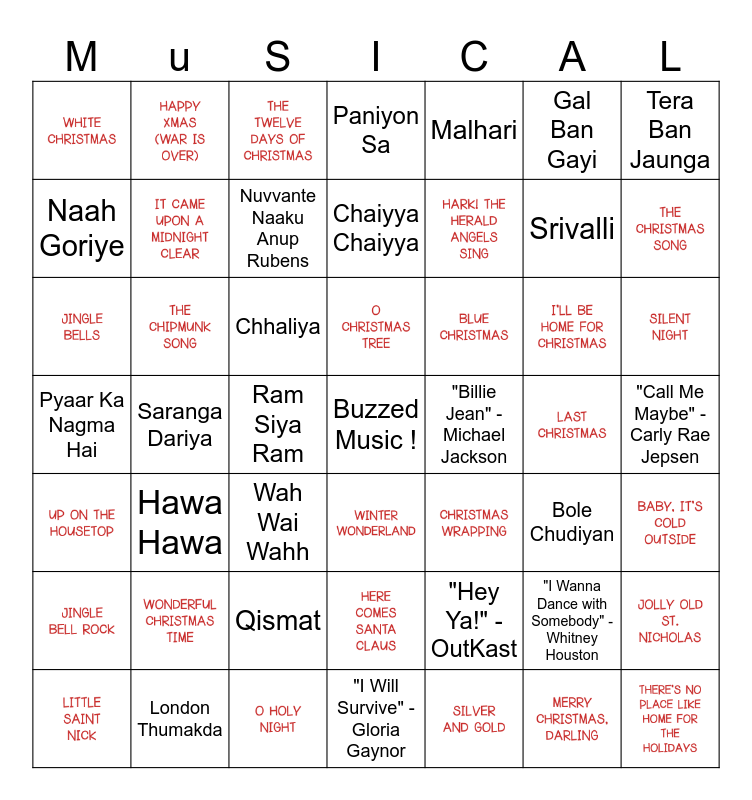 This bingo card has 79 images, a free space and 68 words: Paniyon Sa, Monta Re, London Thumakda, Tumse Milke Dil Ka, Abhi Mujh Mein Kahin, Bole Chudiyan, Rowdy Baby, Dhak Dhak Dhak, Rang Lageya, Meri Jaan Sanjay Leela Bhansali, Saranga Dariya, Ek Tarfa - Reprise, Seeti Maar, Why This Kolaveri Di, Aada Nemali, Pyaar Ka Nagma Hai, Tu Hai Ki Nahi, High Heels Te Nachche, Inkem Inkem, Desi Girl, Urvashi, Sittapata Sinukulaku, Wah Wai Wahh, Gal Ban Gayi, Redrum, Kesariya/ Kunkumamaake/ Kesariya Rangu/ Theethiriyaai/ Kumkumala, Butta Bomma, Yeh Haseen Vadiya/ Kadhal Rojave/ Naa Cheli Rojave, Kolu Kolu, Chaleya/ Chalona/ Hayyoda, Meri Jaan, Nainowale Ne, Kar Gayi Chull, Tera Ban Jaunga, Chhaliya, Bullet Bandi, Nuvvante Naaku Anup Rubens, Hawa Hawa, Srivalli, Malhari, Tu Hi Re, Chaiyya Chaiyya, Chitti Story, Tera Ban Jaunga (Reprise), Naah Goriye, Qismat, Vaathi Coming, Ram Siya Ram, Uptown Funk" - Mark Ronson ft. Bruno Mars, "Shape of You" - Ed Sheeran, "Bohemian Rhapsody" - Queen, "Rolling in the Deep" - Adele, "I Wanna Dance with Somebody" - Whitney Houston, "Smells Like Teen Spirit" - Nirvana, "Shallow" - Lady Gaga & Bradley Cooper, "Billie Jean" - Michael Jackson, "Living on a Prayer" - Bon Jovi, "Don't Stop Believin'" - Journey, "Single Ladies" - Beyoncé, "Hey Ya!" - OutKast, "I Will Survive" - Gloria Gaynor, "Take On Me" - A-ha, "Dancing Queen" - ABBA, "Beat It" - Michael Jackson, "Call Me Maybe" - Carly Rae Jepsen, "Sweet Caroline" - Neil Diamond, "Happy" - Pharrell Williams and "Wonderwall" - Oasis.