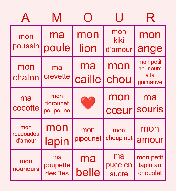 This bingo card has a free space and 25 words: mon lapin, ma belle, ma caille, mon nounours, mon ange, mon poussin, mon chaton, ma poule, mon cœur, mon pipounet, mon chou, ma cocotte, mon choupinet, mon amour, ma crevette, ma bichette, ma souris, mon lion, mon petit nounours à la guimauve, mon tigrounet poupoune, mon petit lapin au chocolat, ma poupette des îles, mon roudoudou d’amour, mon kiki d’amour and ma puce en sucre.