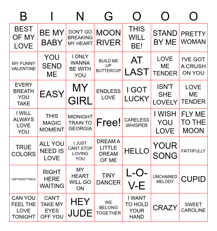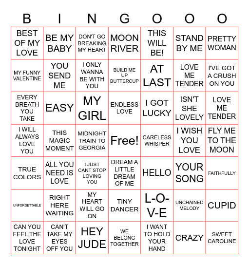 This bingo card has a free space and 48 words: L-O-V-E, LOVE ME TENDER, WE BELONG TOGETHER, THIS MAGIC MOMENT, MY GIRL, FLY ME TO THE MOON, BE MY BABY, CAN'T TAKE MY EYES OFF YOU, STAND BY ME, DREAM A LITTLE DREAM OF ME, PRETTY WOMAN, MOON RIVER, ISN'T SHE LOVELY, I GOT LUCKY, UNFORGETTABLE, I WISH YOU LOVE, MY FUNNY VALENTINE, I'VE GOT A CRUSH ON YOU, UNCHAINED MELODY, THIS WILL BE!, AT LAST, MIDNIGHT TRAIN TO GEORGIA, BEST OF MY LOVE, YOU SEND ME, CUPID, I ONLY WANNA BE WITH YOU, LOVE ME TENDER, CAN YOU FEEL THE LOVE TONIGHT, ENDLESS LOVE, EASY, CRAZY, CARELESS WHISPER, FAITHFULLY, RIGHT HERE WAITING, I WILL ALWAYS LOVE YOU, HELLO, YOUR SONG, EVERY BREATH YOU TAKE, I JUST CANT STOP LOVING YOU, MY HEART WILL GO ON, TRUE COLORS, SWEET CAROLINE, DON'T GO BREAKING MY HEART, HEY JUDE, BUILD ME UP BUTTERCUP, TINY DANCER, ALL YOU NEED IS LOVE and I WANT TO HOLD YOUR HAND.
