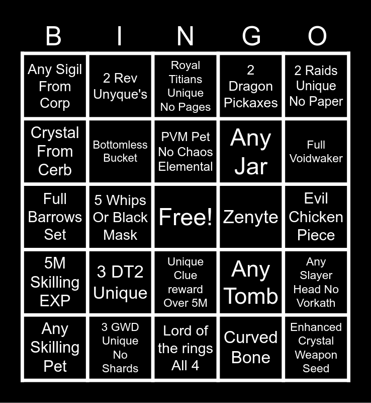 This bingo card has a free space and 24 words: 3 DT2 Unique, 3 GWD Unique No Shards, PVM Pet No Chaos Elemental, Any Skilling Pet, 2 Raids Unique No Paper, Any Sigil From Corp, Crystal From Cerb, 2 Rev Unyque's, Zenyte, Unique Clue reward Over 5M, Any Jar, Full Barrows Set, Any Tomb, Any Slayer Head No Vorkath, Bottomless Bucket, Curved Bone, Evil Chicken Piece, Royal Titians Unique No Pages, Full Voidwaker, 5 Whips Or Black Mask, Enhanced Crystal Weapon Seed, 5M Skilling EXP, 2 Dragon Pickaxes and Lord of the rings All 4.