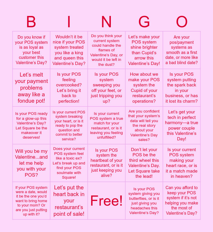 This bingo card has 25 words: Will you be my Valentine...and let me help you with your POS?, Let’s put the heart back in your restaurant’s point of sale!, Is your current POS system a true match for your restaurant, or is it leaving you feeling unfulfilled?, Is your POS system giving you butterflies, or is it just giving you headaches this Valentine’s Day?, Are your pos/payment systems as smooth as a first date, or more like a bad blind date?, Do you know if your POS system is as loyal as your best customer this Valentine’s Day?, Wouldn’t it be nice if your POS system treated you like a king and queen this Valentine’s Day?, Do you think your current system could handle the flames of Valentine’s Day, or would it be left in the dust?, Are you confident that your system’s data will tell you the real story about your Valentine’s Day sales?, Is your current POS system making your heart race, or is it a match made in heaven?, Let’s melt your payment problems away like a fondue pot!, Is your POS feeling overcooked? Let’s bring it back to perfection!, Free!, Don’t let your POS be the third wheel this Valentine’s Day. Let Square take the lead!, Is your POS system putting the spark back in your business, or has it lost its charm?, If your POS system were a date, would it be the one you’d want to bring home to your mom? Or are you just putting up with it?, Is your current POS system breaking your heart, or is it ready to pop the question and commit to better service?, Is your POS system sweeping you off your feet, or just tripping you up?, How about we make your POS system the Cupid of your restaurant’s operations?, Let’s get your tech in perfect harmony—a true power couple this Valentine’s Day!, Is your POS ready for a glow-up this Valentine’s Day? Let Square be the makeover it deserves!, Does your current POS system feel like a toxic ex? Let’s break up and find your POS soulmate with Square!, Is your POS system the heartbeat of your restaurant, or is it just keeping you alive?, Let’s make your POS system shine brighter than Cupid’s arrow this Valentine’s Day! and Can you afford to keep your POS system if it’s not helping you make the most of Valentine’s Day?.