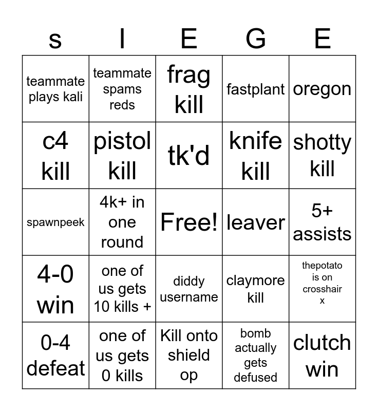 This bingo card has a free space and 24 words: one of us gets 10 kills +, one of us gets 0 kills, tk'd, 0-4 defeat, oregon, teammate plays kali, c4 kill, teammate spams reds, leaver, diddy username, knife kill, spawnpeek, claymore kill, thepotato is on crosshair x, pistol kill, bomb actually gets defused, 5+ assists, frag kill, shotty kill, 4k+ in one round, clutch win, 4-0 win, fastplant and Kill onto shield op.