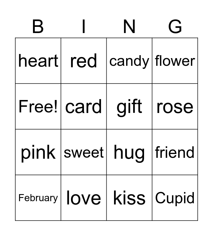 This bingo card has 16 words: love, friend, candy, heart, pink, red, hug, kiss, Free!, card, February, flower, sweet, rose, gift and Cupid.