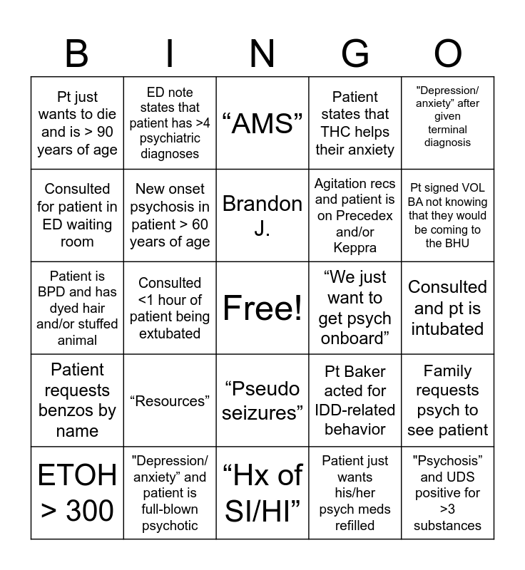 This bingo card has a free space and 24 words: “Resources”, "Depression/ anxiety” and patient is full-blown psychotic, Brandon J., ETOH > 300, "Depression/ anxiety” after given terminal diagnosis, Pt just wants to die and is > 90 years of age, Consulted for patient in ED waiting room, ED note states that patient has >4 psychiatric diagnoses, “We just want to get psych onboard”, “Pseudo seizures”, Agitation recs and patient is on Precedex and/or Keppra, Patient is BPD and has dyed hair and/or stuffed animal, Pt Baker acted for IDD-related behavior, Family requests psych to see patient, New onset psychosis in patient > 60 years of age, Patient just wants his/her psych meds refilled, Consulted and pt is intubated, “AMS”, Pt signed VOL BA not knowing that they would be coming to the BHU, Consulted <1 hour of patient being extubated, "Psychosis” and UDS positive for >3 substances, Patient requests benzos by name, Patient states that THC helps their anxiety and “Hx of SI/HI”.