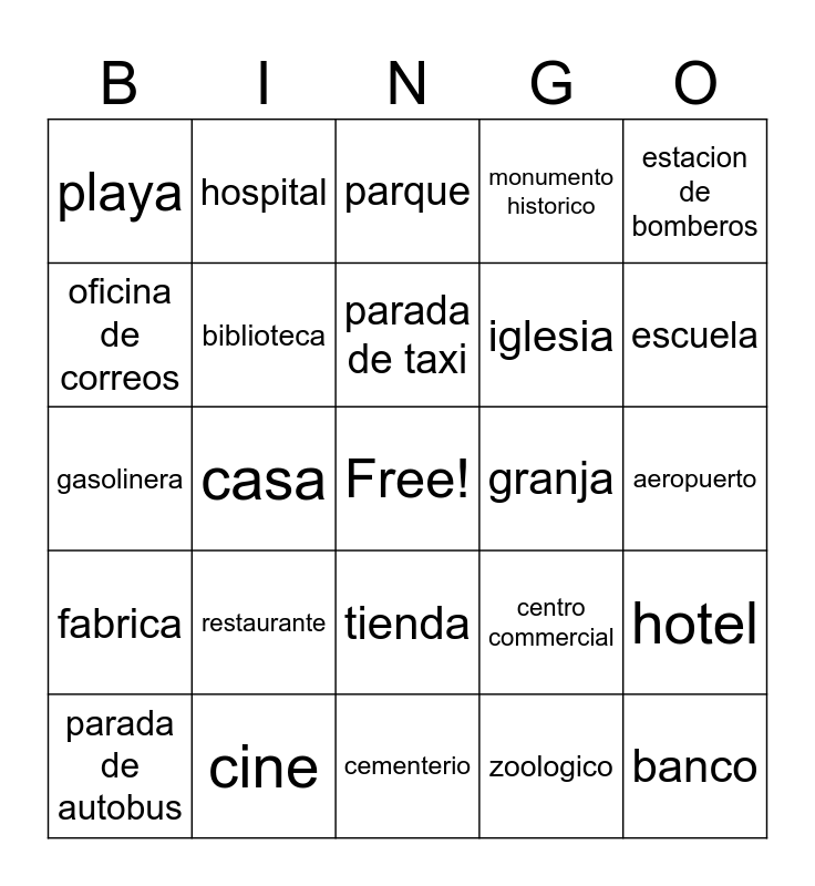 This bingo card has a free space and 24 words: restaurante, cine, parada de taxi, parada de autobus, estacion de bomberos, playa, oficina de correos, hospital, granja, tienda, iglesia, gasolinera, centro commercial, hotel, biblioteca, zoologico, aeropuerto, parque, escuela, casa, banco, fabrica, monumento historico and cementerio.