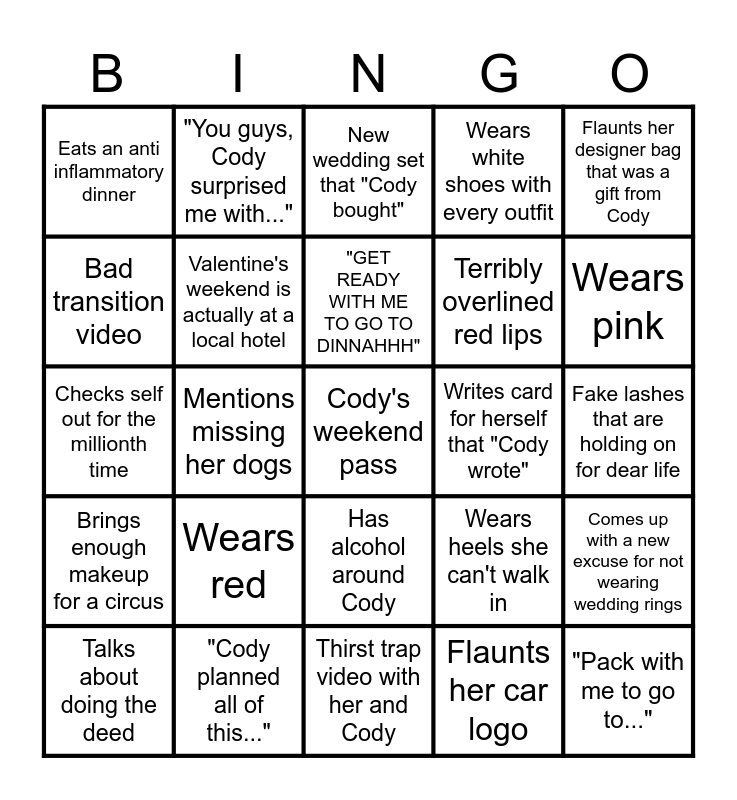 This bingo card has a free space and 24 words: Wears red, "Cody planned all of this...", "GET READY WITH ME TO GO TO DINNAHHH", Talks about doing the deed, Flaunts her designer bag that was a gift from Cody, Eats an anti inflammatory dinner, Bad transition video, "You guys, Cody surprised me with...", Writes card for herself that "Cody wrote", Has alcohol around Cody, Terribly overlined red lips, Checks self out for the millionth time, Wears heels she can't walk in, Comes up with a new excuse for not wearing wedding rings, Valentine's weekend is actually at a local hotel, Flaunts her car logo, Fake lashes that are holding on for dear life, New wedding set that "Cody bought", Wears pink, Mentions missing her dogs, "Pack with me to go to...", Brings enough makeup for a circus, Wears white shoes with every outfit and Thirst trap video with her and Cody.