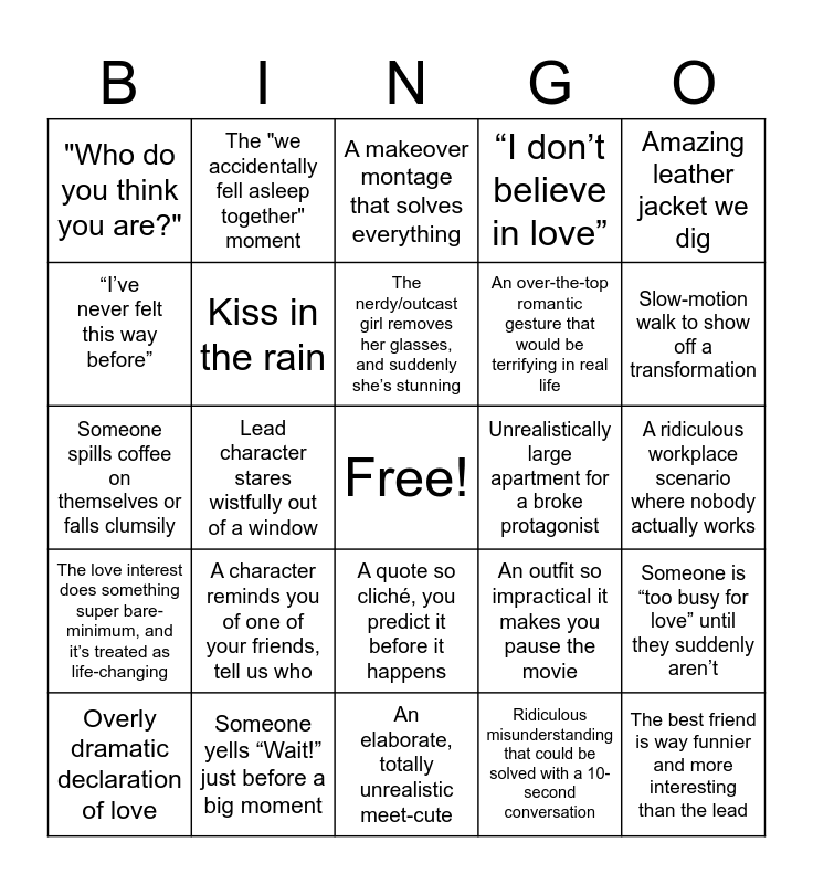 This bingo card has a free space and 29 words: Overly dramatic declaration of love, Someone dances alone in their apartment like nobody's watching, Lead character stares wistfully out of a window, An engagement ring reveal with excessive gasping, "Who do you think you are?", A makeover montage that solves everything, Kiss in the rain, A character reminds you of one of your friends, tell us who, Unrealistically large apartment for a broke protagonist, Someone yells “Wait!” just before a big moment, A ridiculous workplace scenario where nobody actually works, The best friend is way funnier and more interesting than the lead, An elaborate, totally unrealistic meet-cute, Ridiculous misunderstanding that could be solved with a 10-second conversation, Slow-motion walk to show off a transformation, The sassy best friend who only exists to give advice, A quote so cliché, you predict it before it happens, The love interest does something super bare-minimum, and it’s treated as life-changing, Amazing leather jacket we dig, Someone spills coffee on themselves or falls clumsily, An outfit so impractical it makes you pause the movie, Someone trips and falls straight into love (literally or figuratively), An over-the-top romantic gesture that would be terrifying in real life, “I’ve never felt this way before”, “I don’t believe in love”, The "we accidentally fell asleep together" moment, Someone is “too busy for love” until they suddenly aren’t, The nerdy/outcast girl removes her glasses, and suddenly she’s stunning and Someone gives terrible dating advice that miraculously works.