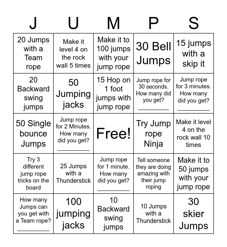 This bingo card has a free space and 24 words: 25 Jumps with a Thunderstick, 100 jumping jacks, 15 Hop on 1 foot jumps with jump rope, How many Jumps can you get with a Team rope? __________, 15 jumps with a skip it, 20 Jumps with a Team rope, 20 Backward swing jumps, Make it level 4 on the rock wall 5 times, Try Jump rope Ninja, Jump rope for 1 minute. How many did you get? __________, Jump rope for 30 seconds. How many did you get? __________, 50 Single bounce Jumps, Tell someone they are doing amazing with their jump roping, Make it to 50 jumps with your jump rope, 50 Jumping jacks, 10 Jumps with a Thunderstick, Make it level 4 on the rock wall 10 times, Make it to 100 jumps with your jump rope, Jump rope for 3 minutes. How many did you get? __________, Jump rope for 2 Minutes. How many did you get? __________, 30 skier Jumps, Try 3 different jump rope tricks on the board, 30 Bell Jumps and 10 Backward swing jumps.