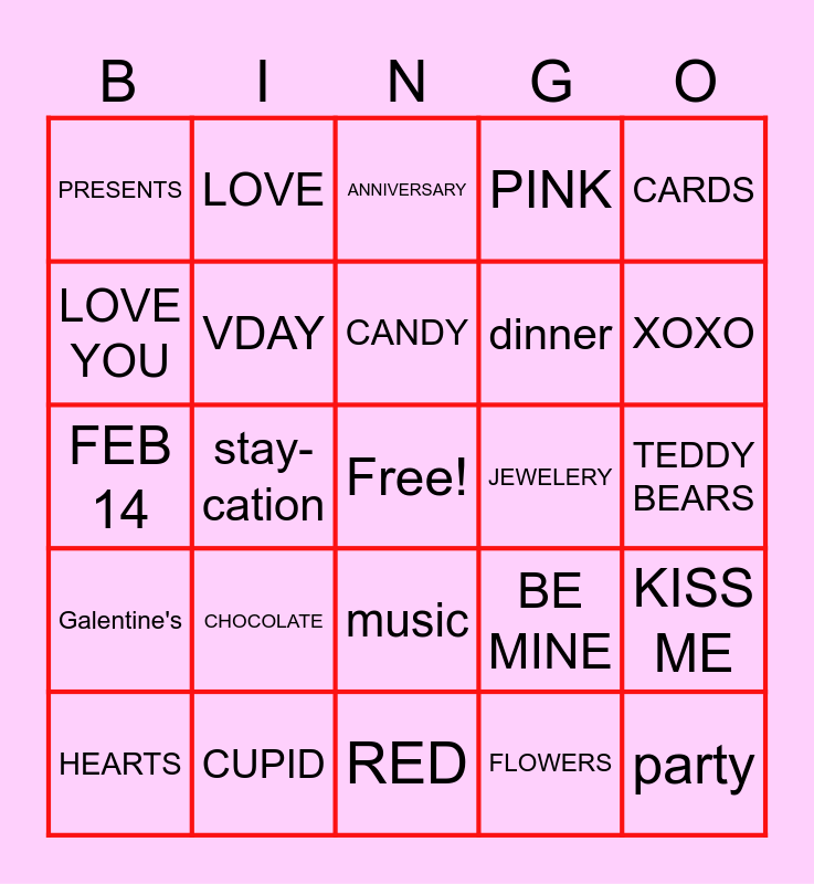 This bingo card has a free space and 24 words: HEARTS, CHOCOLATE, CANDY, FLOWERS, CARDS, PRESENTS, LOVE, ANNIVERSARY, JEWELERY, TEDDY BEARS, FEB 14, VDAY, BE MINE, KISS ME, LOVE YOU, CUPID, RED, PINK, XOXO, Galentine's, stay-cation, music, dinner and party.