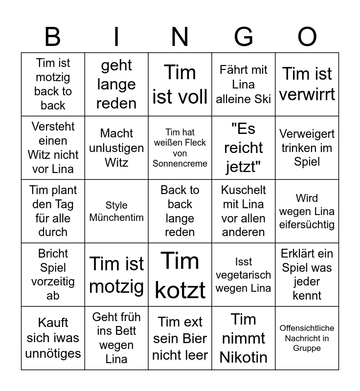 This bingo card has 25 words: Tim ist motzig, Tim ext sein Bier nicht leer, Tim hat weißen Fleck von Sonnencreme, Kauft sich iwas unnötiges, Tim ist verwirrt, Tim ist motzig back to back, Versteht einen Witz nicht vor Lina, geht lange reden, Kuschelt mit Lina vor allen anderen, Tim kotzt, "Es reicht jetzt", Tim plant den Tag für alle durch, Isst vegetarisch wegen Lina, Erklärt ein Spiel was jeder kennt, Macht unlustigen Witz, Offensichtliche Nachricht in Gruppe, Wird wegen Lina eifersüchtig, Tim ist voll, Verweigert trinken im Spiel, Style Münchentim, Back to back lange reden, Geht früh ins Bett wegen Lina, Bricht Spiel vorzeitig ab, Fährt mit Lina alleine Ski and Tim nimmt Nikotin.