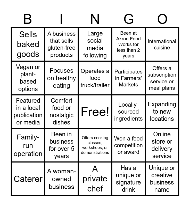 This bingo card has a free space and 24 words: Been in business for over 5 years, A woman-owned business, Operates a food truck/trailer, Caterer, International cuisine, Sells baked goods, Vegan or plant-based options, A business that sells gluten-free products, Locally-sourced ingredients, Offers cooking classes, workshops, or demonstrations, Participates in Farmers' Markets, Featured in a local publication or media, Won a food competition or award, Online store or delivery service, Focuses on healthy eating, Has a unique or signature drink, Expanding to new locations, Large social media following, Offers a subscription service or meal plans, Comfort food or nostalgic dishes, Unique or creative business name, Family-run operation, Been at Akron Food Works for less than 2 years and A private chef.