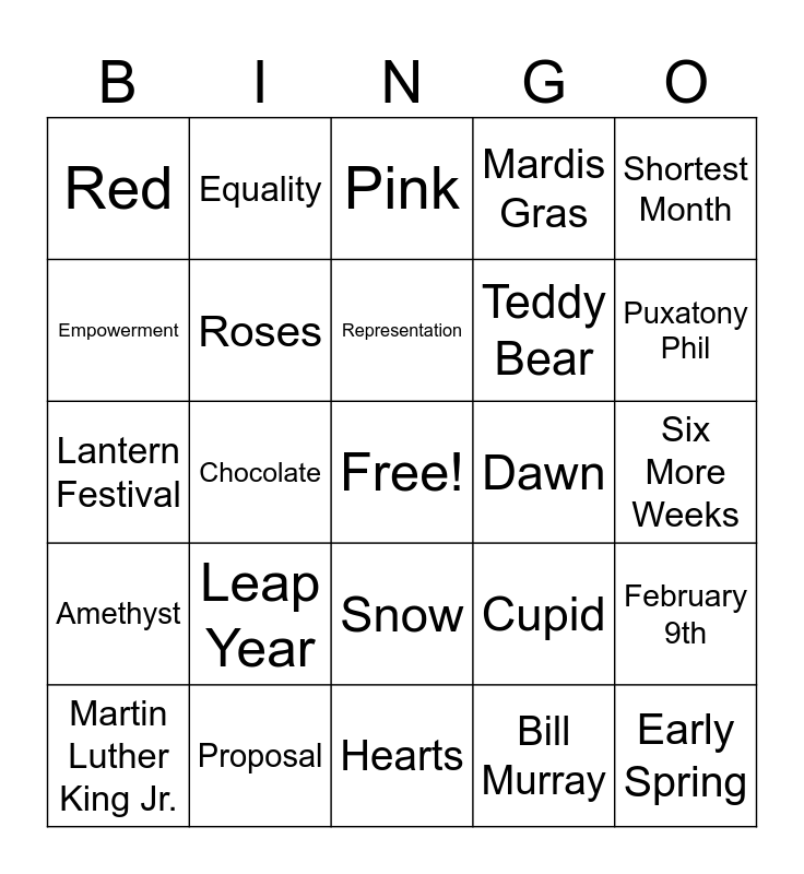 This bingo card has a free space and 31 words: Hearts, February 14th, Chocolate, Valentine, Red, Pink, Roses, Cupid, Dawn, Bill Murray, Six More Weeks, Early Spring, Hibernate, Groundhog, Puxatony Phil, Superbowl, February 9th, Leap Year, Amethyst, Snow, Shortest Month, President’s Day, Martin Luther King Jr., Equality, Teddy Bear, Empowerment, Mardis Gras, Lantern Festival, Proposal, Representation and Chinese New Year.